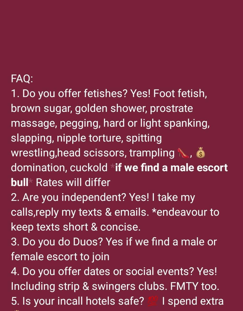 Golden shower, Brown shower extra100,Farts fetish, Dirty talks, SPH, Spanking, Trampling, Pegging extra 50, Nipple Torture, Spitting, Financial dom,Wrestling, Head Scissors, Cuckold see FAQS pic