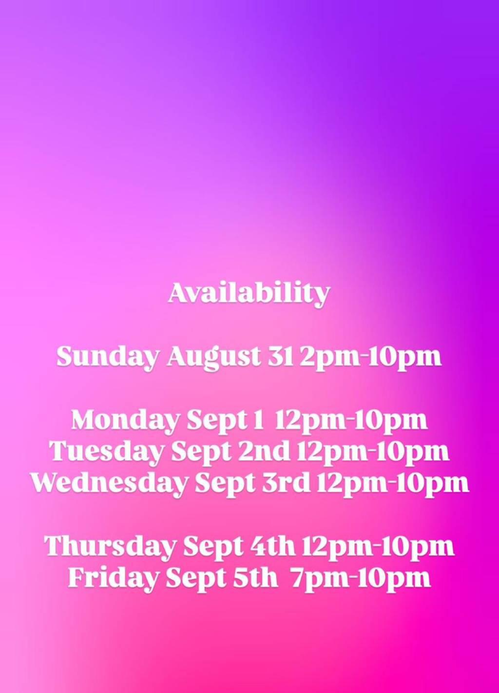 To book Include your name, age, time/duration, your fav color.