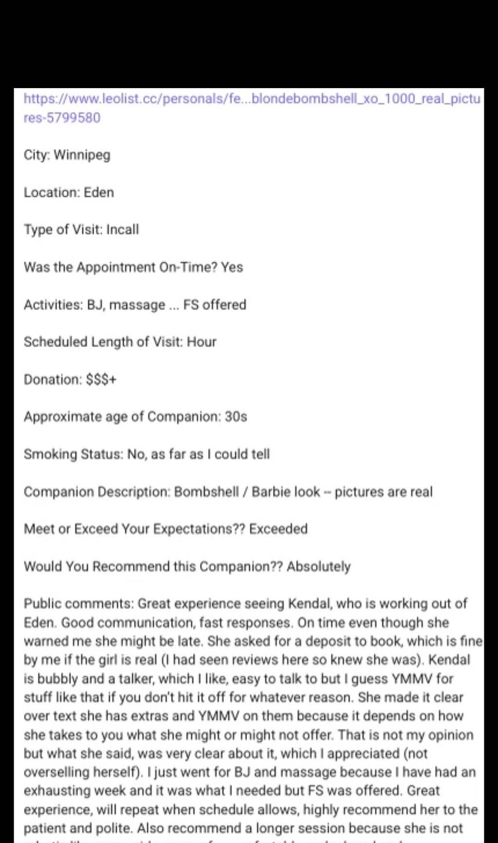 TXT or CALL too BOOK 204-514-9070 Time waster will be immediately blocked. I POST DAILY on my Twitter or my OF Barbiebombshellxoxo too assure you I'm REALwww.@kendal_xoxo.com ❤ Visit my Twitter for daily feeds for verification in REAL xo Also , join my onlyfans @Barbiebombshellxo.or reviews on P3RB